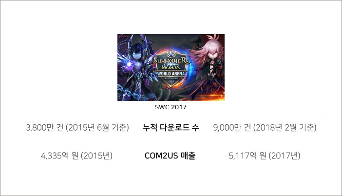 Since its release in 2014, Com2uS has achieved global sales of over 1.0 trillion through this single game. During 2017, the game was experiencing some stagnation in terms of growth. However, with the advent of the global eSports tournament, ‘Summoners War World Arena Championships,’ Com2uS was able to achieve 90 million accumulated downloads and approximated sales of \500 billion. This was a case in which eSports effectively furthered the popularity of a game IP.